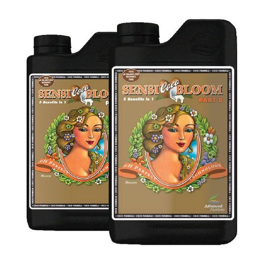 • Advanced Nutrients Sensi Coco Bloom A+B: Pensato per la fase di fioritura, questo fertilizzante bilanciato assicura una nutrizione continua, evitando carenze comuni nel cocco. Promuove la formazione di fiori compatti e aromatici, con risultati professionali anche per i coltivatori meno esperti.